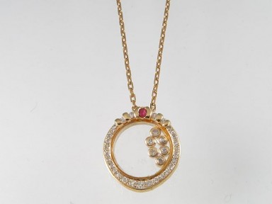 with 35 diamonds and a ruby in 18ct gold, on an 18ct gold chain. Total wt 8.7g. -