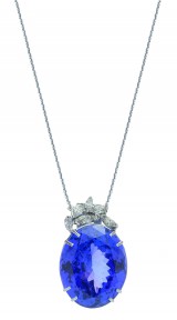 Centrally set with an oval tanzanite weighing 49.30cts to a surmount set with six marquise cut diamonds totalling 0.85cts, suspended on a belcher link chain, in 18ct white gold, IGI report and independent valuation available. -