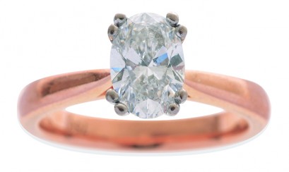 The oval diamond weighing 1.0ct, in a double four claw setting, in 18ct rose gold, ring size J-K. -