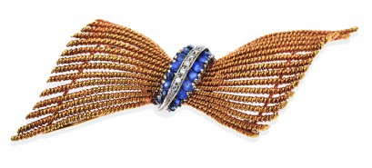 The bow design in rope twist detail, with central feature of sapphires and diamonds, in 18ct gold. -