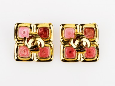 with central Chanel logo and coloured stones, gold plated, clip-on, with original box (2) -