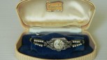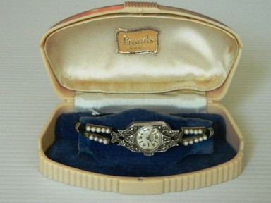 Norexa sterling silver watch, with a cream dial, gold hands, numbers/battons. The watch is set with marqusites and akoya type pearls. It has a manual movement and is in working condition. It has the original Prouds plastic box. -