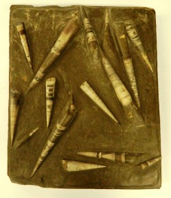 Lot Description:A large school of Squid Orthoceras, in slab form with stand
