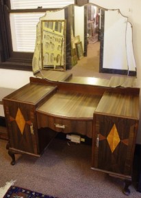 Lot Description:Art deco walnut dressing table with geometric inlay and internal drawers, 120cm wide, 153cm high