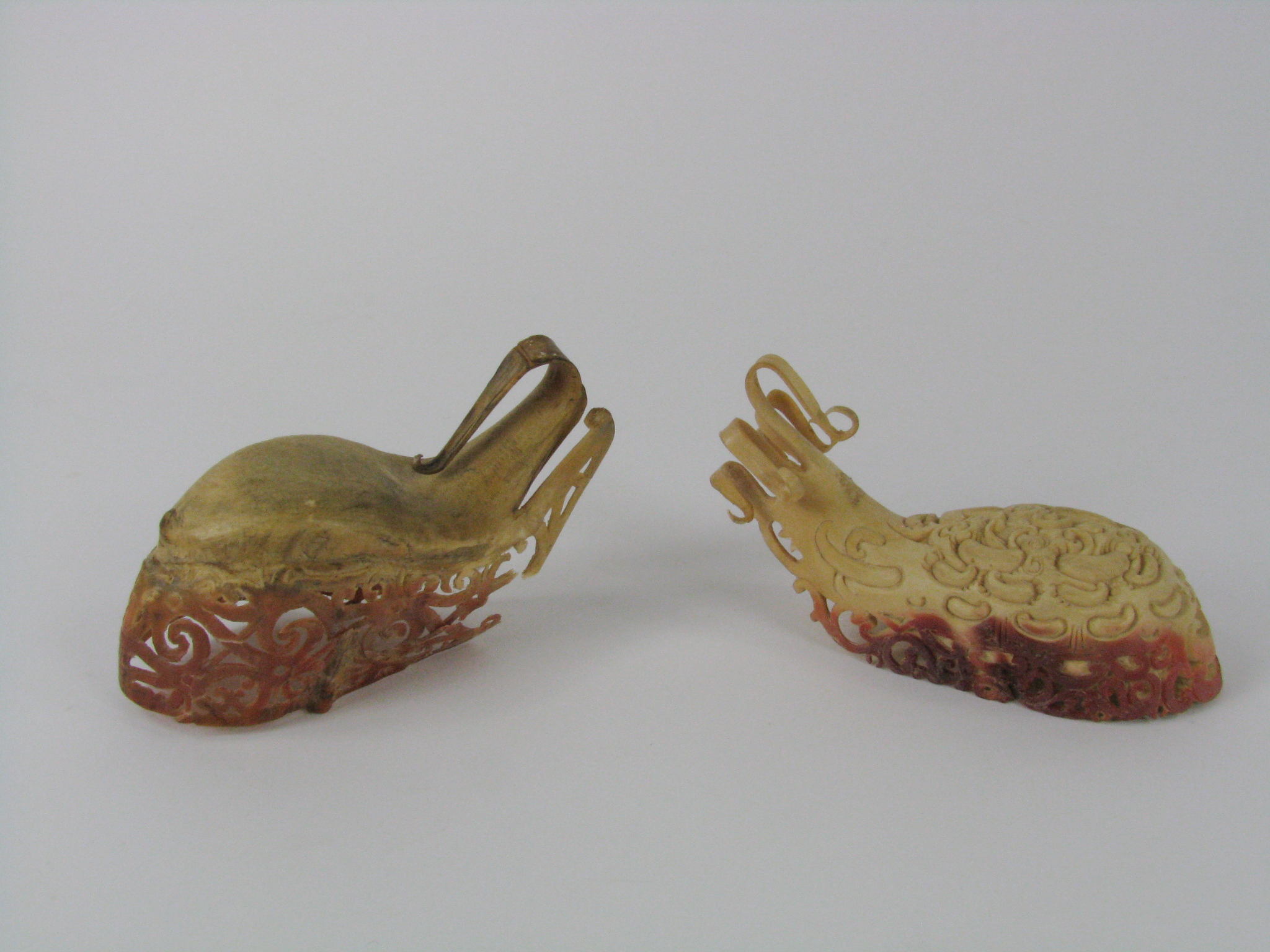 of bird of paradise beak sculpted with openwork and ancestor motifs in relief, 11-12cm (2) -