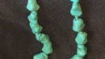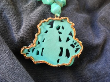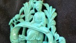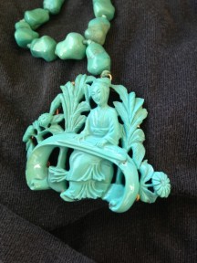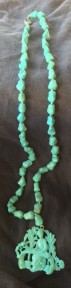 carved as a female immortal seated at a rustic table, with unmarked but probably 14 carat findings mounted on a turquoise beaded necklace , l 23.5cm w 30 grams -