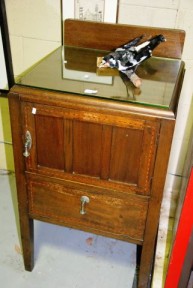 single drawer over drop front door, plate glass top, c.1920s with string inlay -