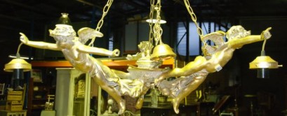 Lot Description:Ornate 3 branch hanging light fitting in the form of 3 winged cherubs each supporting a single light