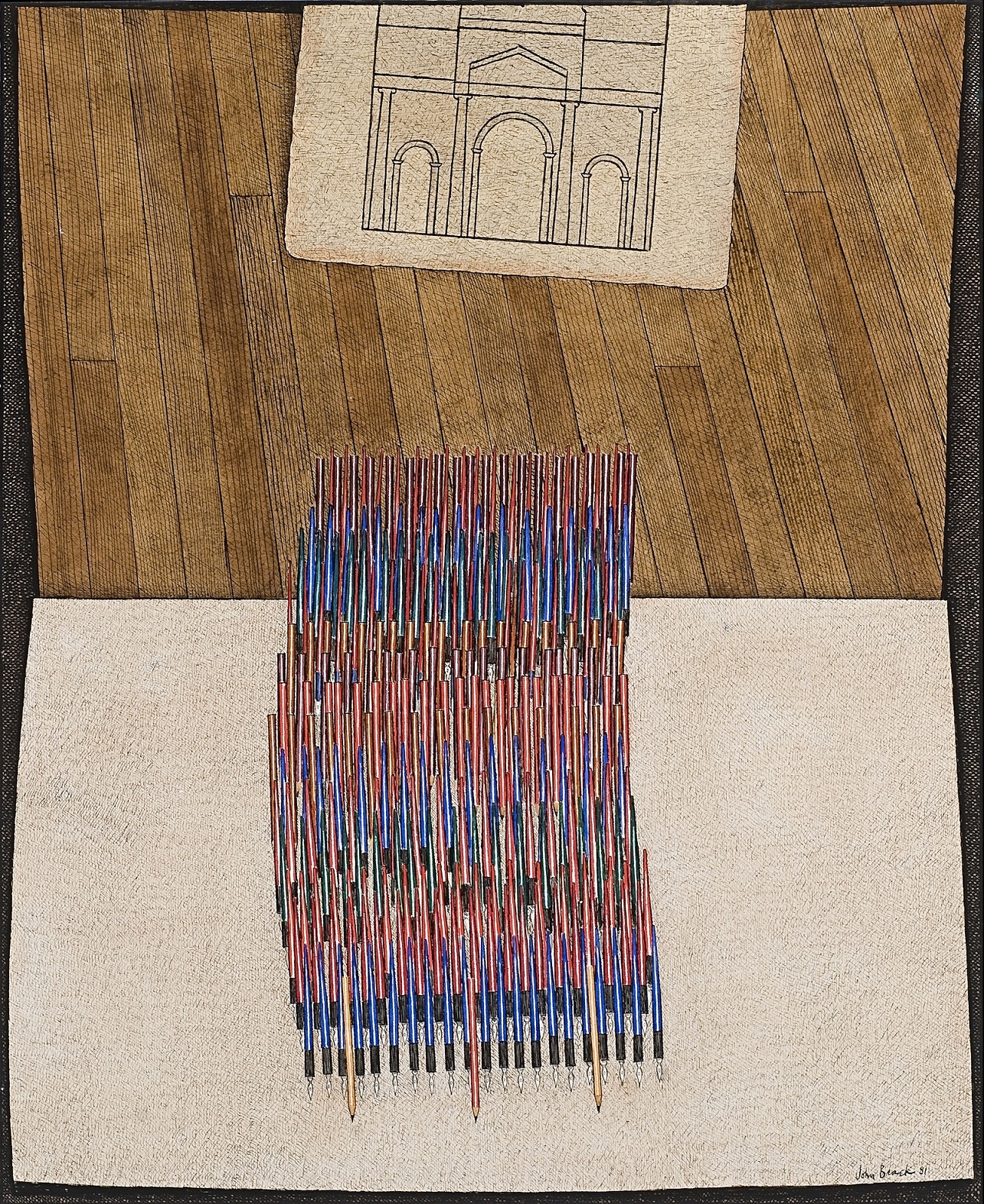 Notes:Essay: Conceived in the same year as John Brack's monumental masterpiece "The Battle", now held in the collection of the National Gallery of Australia, Canberra, "Triumphal March" may be seen as the logical conclusion to the thematic cycle. As Sasha Grishin notes, "Brack commenced a very deliberate search for a new visual metaphor that would permit him to express the whole complexity of human interconnections."1 A period of experimentation with other motifs such as walking sticks and umbrellas led Brack to pens and pencils, the implements of his craft. Here Brack had his protagonists with which to enact the grand narrative arcs of conflict; pens and pencils engaged in conquests worthy of the Mycenaean warriors. These are the great chronicles of human civilisation, an endless cycle of destruction, colonisation and rebirth. Of the subject Ted Gott noted, "within this basic genus of conflict, across a decade of creative engagement, Brack's battle composition explored the realms of human interaction and confrontation with permutations and perverse subtleties as endless as the relentless course of history itself."2 Shown here, the victorious army march in perfect unity, the grand gate or triumphal arch through which they must have just progressed shown in Neo-classical form. Carefully conceived and painstakingly executed, one of the key concerns of Brack's battle paintings was the dehumanisation of the individual once they are subsumed by the mass. The pens and pencils, once tools of an artist's trade, are here transmogrified into a machine of war which marauds, triumphs and collapses in perpetuity. As observed by Gott, "Territorial battles and striving for power are constants of human existence, whether it be office politics or world affairs. Brack's many "battle" compositions also consider the groups which are inexorably connected to the rules of society, as well as the tribal arrangements to which we all unintentionally adhere. Within this overarching view of the world struggle which simultaneously destroys and advances particular branches of civilisations, John Brack's paintings of the 1980s also explore numerous sub-themes such as the ironic duality of society's simultaneous need for and subversion of hierarchical structure... The allegorical reading of many of these pictures is simple enough - We are taken over by Them, and pushed out; but then Them becomes Us, as we realise we are all the same; and this cycle of aggression, colonisation and assimilation is perpetual."3 1. Grishin, S., The Art of John Brack, Oxford University Press, Melbourne, 1990, vol. I, p. 140 2. Gott, T., A Question of Balance, John Brack 1974-1994, Heide Museum of Modern Art, Victoria, 2000, p. 14 3. Ibid., p. 13 MERRYN SCHRIEVER