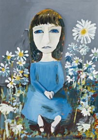 Notes:Essay: One of the most appealing things about Charles Blackman's art is its sense of childhood wonderment, as if seeing the world for the first time. Things important are large and the lesser, small. Experience, nevertheless, has a touching presence in this world of innocence, the wide-eyed look encompassing the perils as well as the beauties of life. In the Schoolgirl series of 1952-54 he mingles the dark with the light; Alice in Wonderland 1956-57 mingles fantasy and fact, of small and growing big, of the White Rabbits, Mad Hatters, and March Hares of this world. Importantly, Dreaming Flowers c1955-56 was painted between these two major series, Dreaming Flowers and Star Gazer 1955 (private collection, Sydney) paving the way for the flowered fantasy world of Alice. In these and other works there are three constants - a fascination with eyes, flowers, and dreaming. The world of dreams is special to childhood and youth, much more than mere wish fulfilment. For an artist eyes are of fundamental importance. For Blackman there is the added poignancy of his wife Barbara's growing loss of sight, of entering a visually darkened world. Flowers offer a tender beauty. Nothing is more delicate than a flower. Their exquisite beauty is one of Blackman's most successful and touching metaphors of life. Dreaming Flowers c1955-56 is redolent with such things. The child-girl is modelled on Barbara, the set of her face opening up inner thoughts and deep feelings, extended through the fixed look and stillness of figure. Bright blue eyes and slightly lighter dress evoke the symbolism of the colour: traditionally of purity and innocence, its attributes are extensive, including the celestial. As in Dreaming Flowers, the theme of the solitary figure runs throughout Blackman's art. These singular paintings also opened the door to another important group, the faces and flowers series of 1959. Of the many splendid examples, Girl and Yellow Bouquet 1959 is in the collection of the University of Western Australia and The Presentation 1959 in a private Sydney collection. Here, and in our painting, the contemplation of the splendour of flowers and colours becomes all the more acute in the knowledge of the darkness descending, removing them from sight. The contemplative mood of these works embraces deep feelings of isolation touched with poetic lyricism. In Dreaming Flowers Blackman sets his figure in an intimate bower of white daisies with yellow, sun-like centres. As symbols of childhood innocence they gently harmonise with the appealing simplicity and modesty of the seated figure. Her small feet extend the feeling of diminutive vulnerability. Blackman's brush holds time still so that such transience does not fade away. DAVID THOMAS