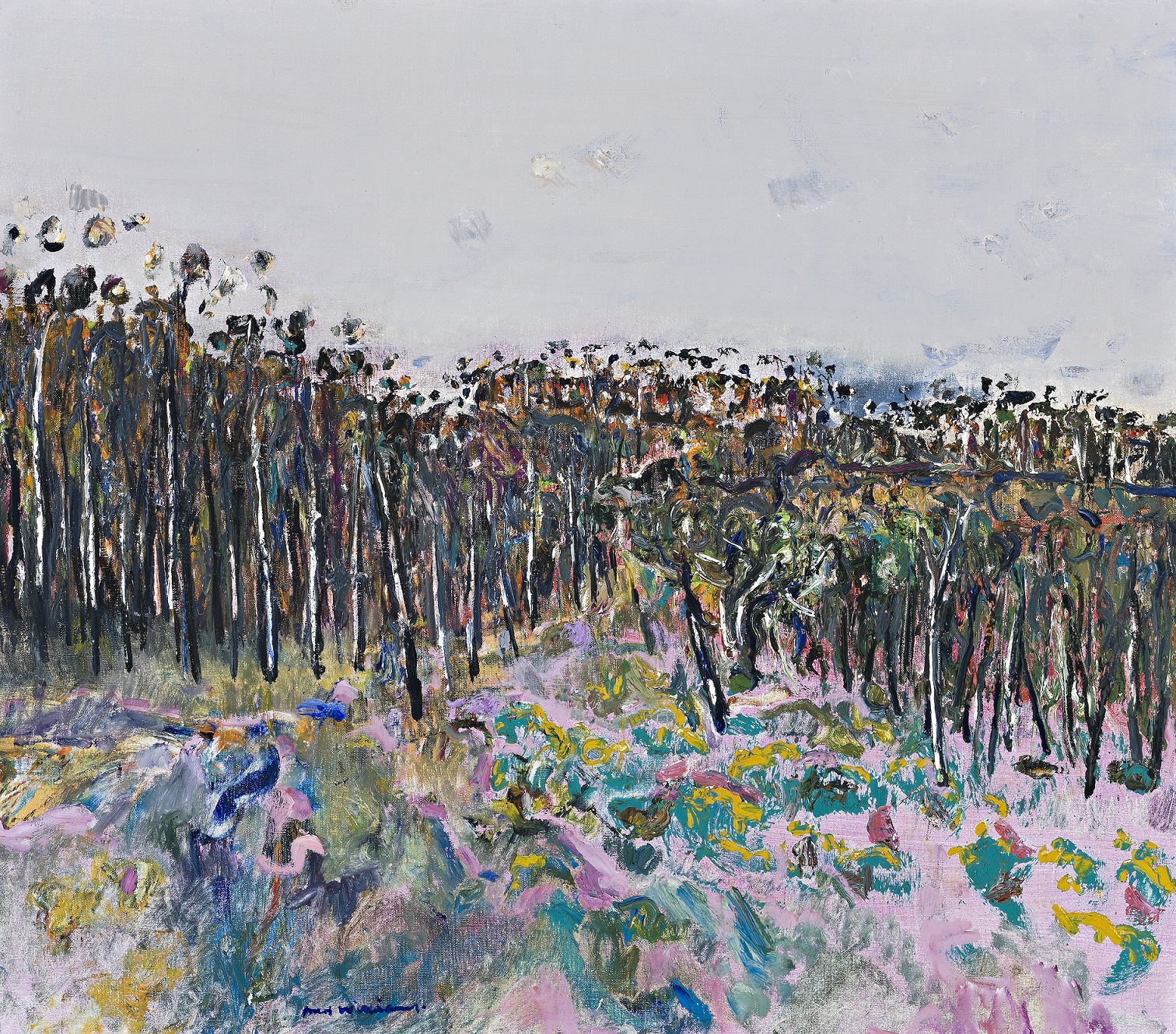 Notes:Essay: During 1972, the Yan Yean Swamp not far to the north of Melbourne held a special appeal for Fred Williams. Working out-of-doors from April to September, he made many daily painting trips, remarking in his diary for 17 September "Today was the 11th time I have worked from this spot - it is really one of the best places to work from I have ever come across!"1 Williams's palette had undergone considerable change introducing a wider and richer range that revealed his considerable gifts as a colourist. The colours of the Yan Yean landscape fascinated him, providing an ideal opportunity to experiment with the new palette. This is strikingly apparent in Yellow Gorse, Yan Yean 1972, where cobalt blues and violets, with mauves and brilliant yellows in the foreground translate into a field of abstract expressionist delight and painterly texture. The broad treatment of the foreground is characteristic of several of his Yan Yean landscapes, especially Yan Yean II (Dog chasing Possum) 1972 and Yan Yean Swamp I 1972, both in private collections.2 Williams likewise outlined the trees and other features in black. Providing effective containment for the bursts of colour, black heightened the imagery as a balance to the abstract fields of colour where it is absent. Painted directly from nature, they follow a more conventional landscape format than previously. Although Williams continued his fascination with the flat picture plane, there is a greater sense of pictorial illusion and depth. In Yan Yean II (Dog chasing Possum) and Yan Yean Swamp I Williams singles out the extraordinary shapes and contortions of pairs of gums and sets them against the thicket of trunks. The gorse contrasted with the trees attracts the eye in our painting. Full of liveliness, it has a greater sense of immediacy, that spontaneity of realisation that comes from working directly from the motif. A larger, rather majestically composed oil, Yan Yean 1972, is in the collection of the Queensland Art Gallery. As James Mollison has pointed out, it was originally conceived as the vertical centrepiece for the landscapes commissioned in 1972 for the foyer of the new Adelaide Festival Centre.3 (Williams finally decided on the horizontal format throughout.) Significantly, it was David Wynn AO (1915 - 1995) who acquired Yellow Gorse, Yan Yean. Wynn was a celebrated figure in the Australian wine industry, who introduced the iconic wine flagon and cask. He also had a very perceptive eye for art and developed a collection noted for its quality and individuality. Wynn served on the Council of the National Gallery of Australia, Canberra, and extended the art of the Adelaide Festival Centre Trust where he was chairman from 1975-80. Yellow Gorse, Yan Yean was a key work in his collection, which included works by Russell Drysdale, William Delafield Cook, and Charles Blackman. 1. Quoted in Mollison, J., A Singular Vision: The Art of Fred Williams, Australian National Gallery, Canberra, 1989, p. 15 2. See McCaughey, P., Fred Williams, Bay Books, Sydney, 1980, pl. 140, and Mollison, op. cit., p. 156 for colour illustrations of these paintings. 3. Mollison, op. cit., pp. 159-161 DAVID THOMAS