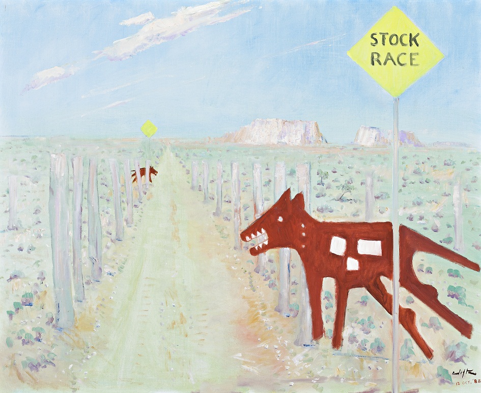 Provenance:Private collection, Melbourne, acquired directly from the artist in 1990; This Northern Territory subject shows a cattle trail flanked by tin dogs attached to the fences and protecting the properties within.