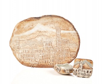 A small lidded box and a plate, both with architectural and landscape decoration. (2)