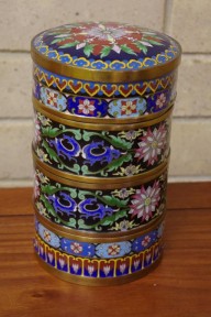 comprising of 3 vertically stacking compartments and a deep lid, ornate cloisonne on the outside, light blue enamel on the inside and base, 21cm high -