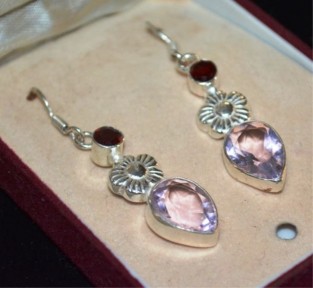 Lot Description:Pair of drop silver amethyst and ruby earrings