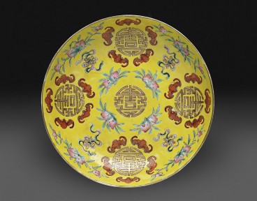 with shallow rounded sides painted on the interior with a central gilt shou medallion within peach sprigs, encircled around the cavetto with four further shou medallions each within a circle of five confronting iron-red bats, interspersed with ribboned wan and peach sprays, all reserved on the bright yellow ground, the underside with detached sprays of hibiscus, lotus and peony, the base inscribed in iron-red with a four-character mark, box