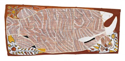 Notes:This work is accompanied by a certificate of authenticity from Maningrida Arts and Culture (attached verso) which states in part: 'It is well known that Aboriginal art often depicts images of sacred totems or dreamings of Aboriginal culture. However, the world of the non-sacred also provides a rich source of subject matter for Aboriginal art. Much of the rock art of western Arnhem Land, for example, depicts secular topics such as common food animals and plants, depicted because of their importance economically but also merely because of their existence in the environment. 'The artist has painted a Birlmu 'barramundi'. During the dry season the barramundi is an important food source for inland Aboriginal people. These fish are caught throughout the artist's clan estate, either in fishtraps woven from pandanus or sedge grass, or else hunted with spears and fishing lines in billabongs and streams where they shelter from the sun under fallen logs. 'The plant forms around the fish are wayukand mardabul 'water lily' another common food source Aboriginal people living in the region. This depiction refers to the birlmu found at Mumeka, the outstation where the artist often lives. There is a creek near Mumeka which is an excellent barramundi fishing spot in the dry season.'