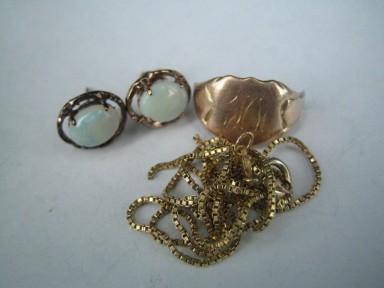 Lot Description:A 9ct Gold Box-Link Neckchain And A Signet Ring (Parts Only) And A Pair of Opal Stud Earrings