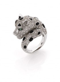 Lot Description:A stylish modern gold, diamond and onyx leopard head ring