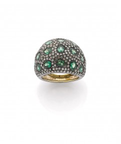 Designed as a high hollow dome profusely set with small brilliant cut diamonds around seventeen oval tsavorite garnets.
