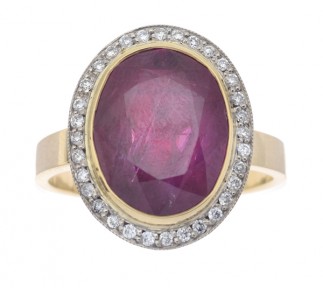 Of cluster design, featuring an oval collet set ruby weighing 7.38cts, within a border of round brilliant cut diamonds totalling 0.16cts, in 18ct gold, ring size N-O. -