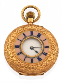Crown wind movement, half hunter, circular white dial with black Arabic numerals, 18ct gold engraved case with enamelled Roman numeral detail, 40mm diameter. -