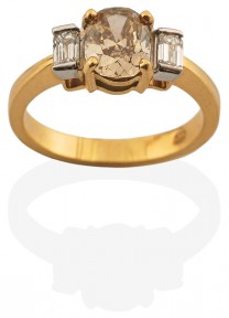 Centrally set with an oval cognac diamond, flanked by an emerald cut diamond to either side totalling 0.32cts, in 18ct gold, ring size N-O.