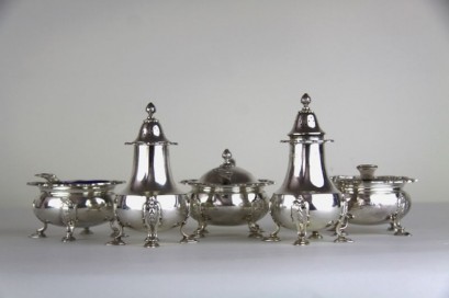 Gorham Manufacturing Co, 1920. 536gm. The salts and mustard are of globular form, with blue glass liners on pad feet with conforming pepperettes. -