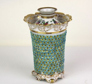Cylindrical flared form with moulded flower head on scrolled feet with gilt decoration, the cover painted with sprigs of flowers. Under glaze blue JP mark. 18cm high.