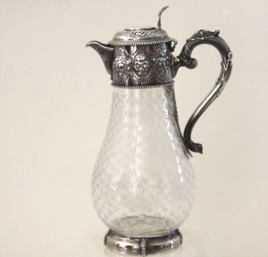 Maker: Walter & George Sissons, Sheffield, 1867. Tapering bulbous form with lozenge and flower head decoration, with a silver collar with chased flower head reserves, and a handle and cover on a silver base. 27cm high.