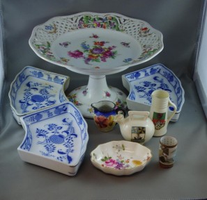 with pierced border and floral decoration, together with 3 miniature jugs, a Royal Crown Derby pin dish, 3 Villeroy and Boch dishes and a miniature Japanese vase, -