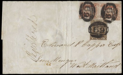Murrurundi - West Maitland, franked by laureated 1d scarlet vertical pair + 6d yellow-brown each cancelled "69". The reverse annotated "Murrurundi / 15 Jany / 1853" and with a Crown Oval "WEST MAITLAND" arrival datestamp. A most attractive franking. -