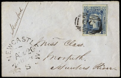 from Newcastle to Morpeth, Hunters River bearing a superb 2d Laureate, cancelled by numeral "55" with a "NEWCASTLE / N.S.W." datestamp on the front. -