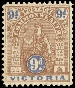 9d VICTORIA beneath COMMONWEALTH arch design electrotyped proof in brown and blue on unwatermarked paper. The only recorded example and part of the Postmaster-General's first attempts to create a standardized Commonwealth stamp design. This design was only issued in New South Wales and Queensland with NSW singles (2) and QLD (blk 4) accompanying the proof.BW V104E (2) -