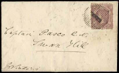 written from the Deanery, Melbourne, addressed to Captain Pasco, R.N. at Swan Hill, franked 4d, cancelled by barred numeral "1", backstamped with Kerang barred oval and Melbourne cds. The Bishop relates details of his travels and writesof "embarking for China". Address panel signed "E (?) Victoria". Unusual. -