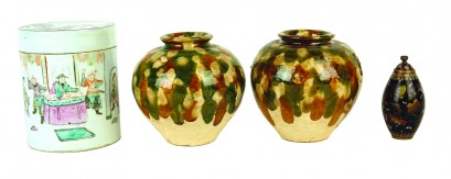 decorated with speckled sancai glazes, ovoid shape with small everted rims. Height 110. -