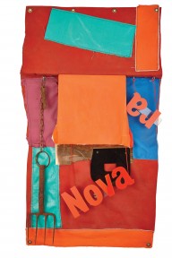 vinyl cloth with perspex, tarpaulin, found chain, gardening fork and cotton fabric mounted on plywood