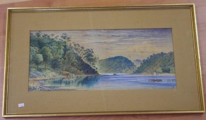 paddle steamer and canoe in mountain river, signed 'C. Winn 77' lower right, 22cm x 51.5cm -