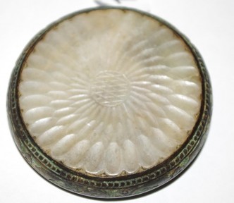 with carved jade centre set in ornate metal buckle, 7cm diameter approx -
