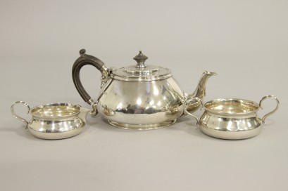 the unadorned pot with an ebony handle and similar sugar and creamer. E. Barnard & Sons, London 1934. Weight 840g. -