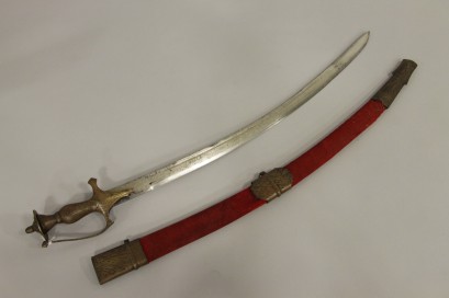 with incised pattern to brass grip, with knuckle guard and circular pommel. The blade with acid etched scroll leaf pattern and double edged point. Leather & brass scabbard.
