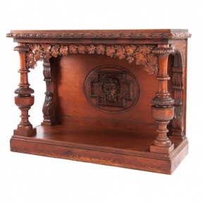 the freize carved with laurel and grapevines, the panelled back with a carved mask decoration, the supports scrolled and turned on a platform base.