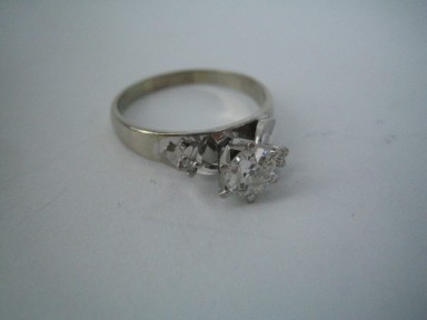 with an early modern brilliant cut diamond estimated to weigh 0.50ct (girdle chipped) claw-set with two smaller diamond in 18ct white gold. Weight 3.7g. -