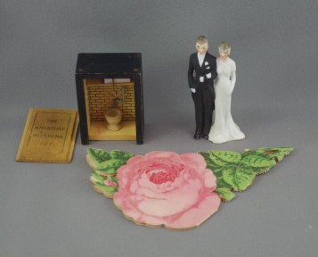 comprising of a ceramic wedding cake ornament, "The Miniature Receiving Set" toilet in a box and an English fold out souvenir -