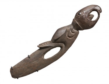 Notes:In areas of the Sepik region of New Guinea, local hunters use spear throwers which are made from bamboo and often have carved hardwood attachments bound onto them. This attachment was used as a guide for the placement of the spear into the hollow shaft of the bamboo spear thrower. The guide also holds the spear in place until it is thrown. These guides represent totemic clan motifs. This expressive example has captured the essence of the cockatoo, which is often represented in Sepik carving.