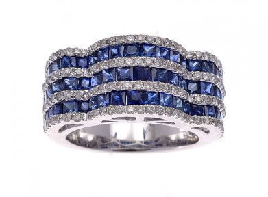 Featuring rows of sapphires and round brilliant cut diamonds in a scalloped mount, in 18ct white gold, ring size M-N. -