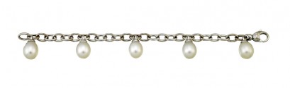 The 18ct white gold cable link bracelet suspending five drop-shaped cultured pearls measuring approximately between 11.10 and 11.80mm, length approximately 200mm, signed Paspaley.