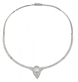 The articulated hinged collier set to the front with a line of brilliant-cut diamonds between a pear-shaped plaque of cluster design centring a round brilliant-cut diamond weighing 2.23 carats above a pave-set brilliant-cut diamond surround, the small diamonds together weighing approximately 4.00 carats, mounted in 18ct white gold, gross weight approximately 25.66 grams, inner circumference approximately 420mm. -