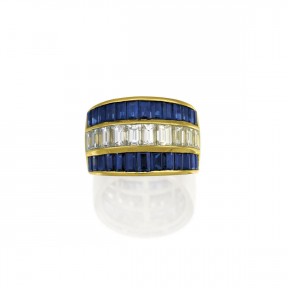 The tapering band channel-set with a row of baguette diamonds between similarly-cut sapphire borders, mounted in 18ct gold, size L. -