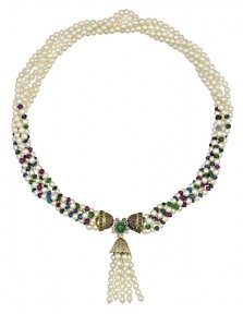 Designed as a torsade of five strands of cultured pearls embellished at the front with ruby, sapphire and emerald beads, set with an emerald and diamond flowerhead cluster supporting a diamond capped pearl tassel, the clasps similarly set, length approximately 420mm. -